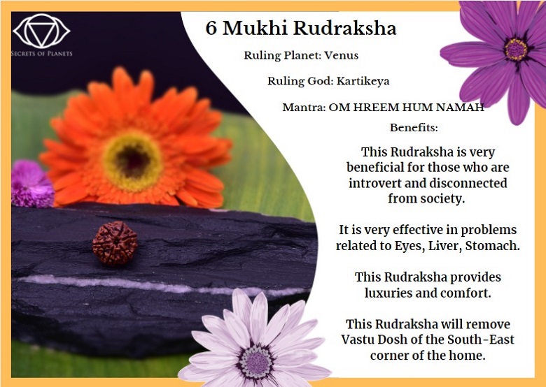 The Six Mukhi Rudraksha can increase your attractiveness. You can wear this for attracting the right knowledge, wealth and youthfulness. You will be blessed with wisdom, increased intelligence, will power and a steady mind. It improves your artistic qualities, expression power and oratory skills.